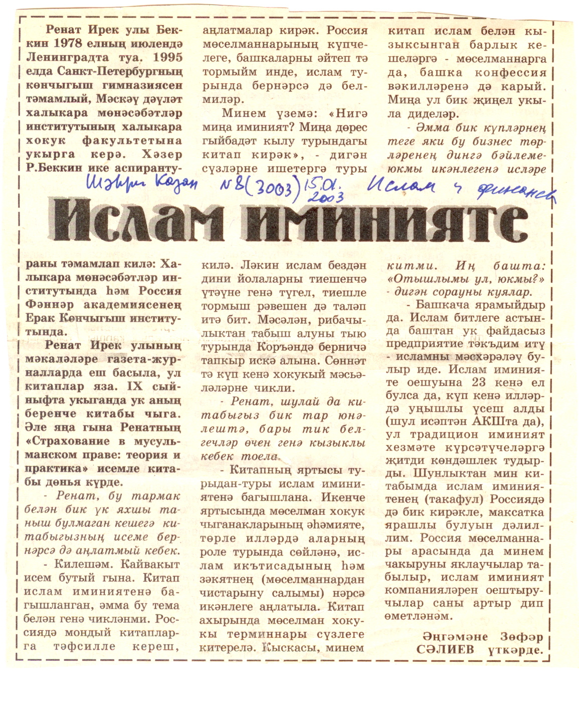 Ислам иминияте (на татарском языке) // Шәhри Казан. – 2003. - № 8 (3003). – 15 января.